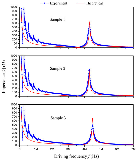The theoretical impedance frequency responses of the sample PZT disks obtained from the simplification of the present model are presented and compared with the experimental results in Figure 4. As we can see in Figure 4, for the thickness stretch mode, the resonant and anti-resonant frequencies obtained using the present model match well with the experimental results. The mismatch in the peak value of the absolute impedance is due to the estimation of the complex damping factor Q. Actually, the specific damping factor for each sample PZT disk can be identified using the present model if needed.