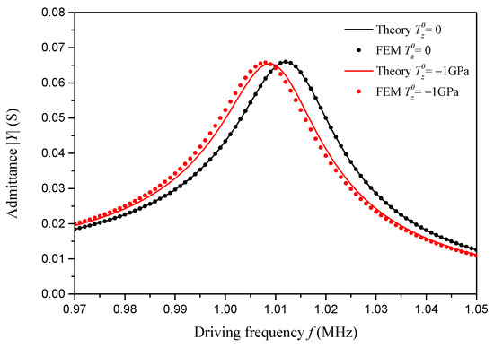 Based on the present impedance analysis model, using Equation (27), considering the internal complex damping factor and the external viscoelastic constraint, respectively, to be , and , the theoretical admittance frequency responses of the sample piezoelectric plate with different initial stresses are determined and are presented in Figure 5 and compared with the finite element results. In this finite element method validation, two initial stresses are considered, i.e., and .