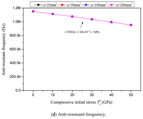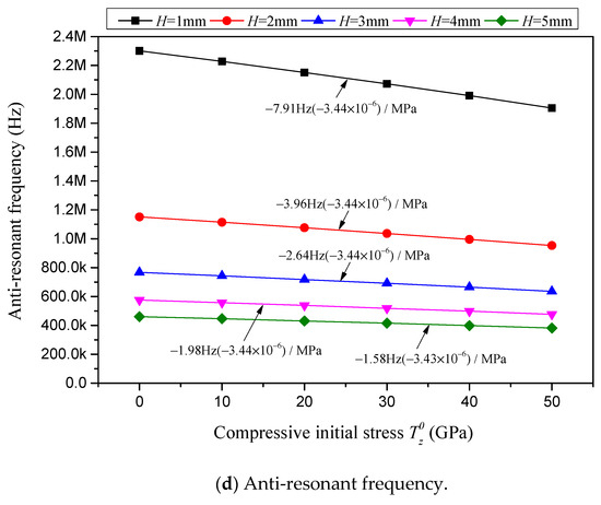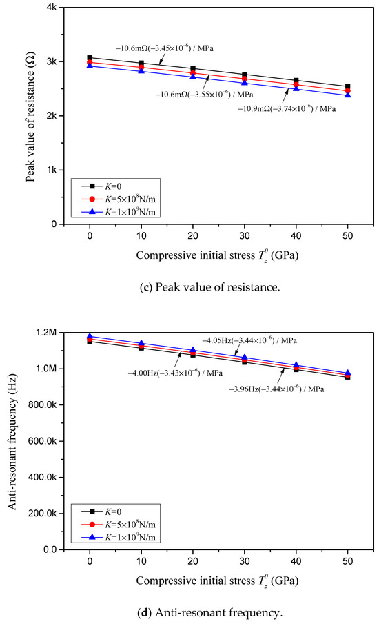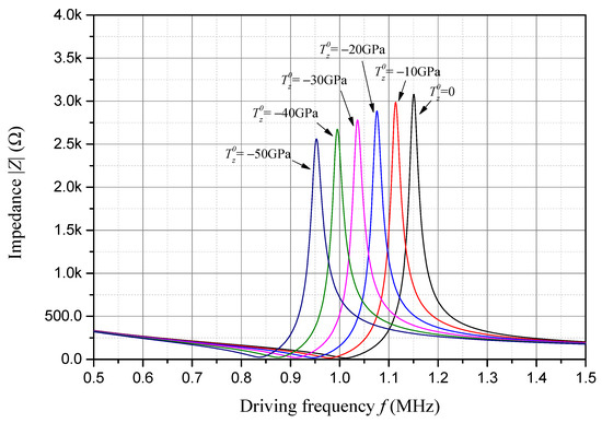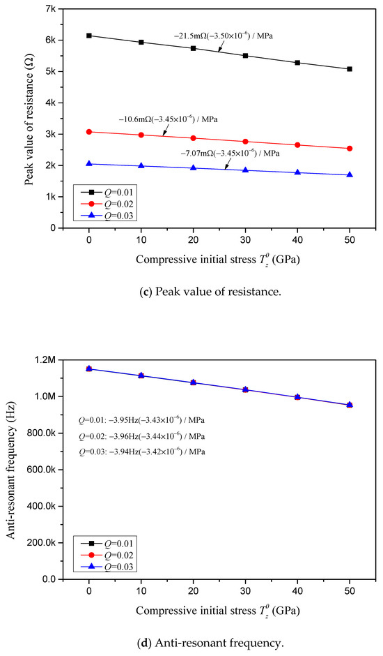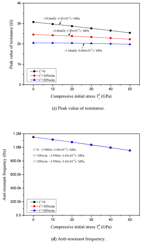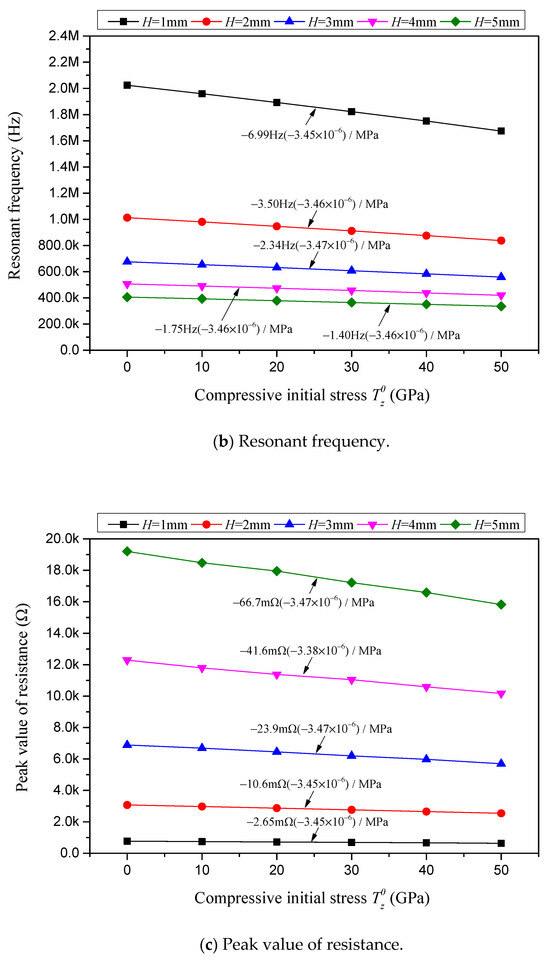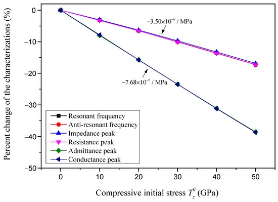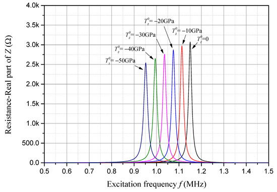 To clearly show the effect of the initial stress on the impedance characterizations, extremely large compressive initial stresses are considered in the following numerical study, i.e., 0, −10 GPa, −20 GPa, −30 GPa, −40 GPa and −50 GPa. These considered initial stresses exceed the ultimate load-bearing capacity of PZT-5H. For much smaller initial stress in practice, the effect on impedance characterizations should have the same pattern, as illustrated in the following section.