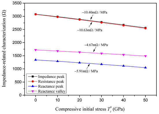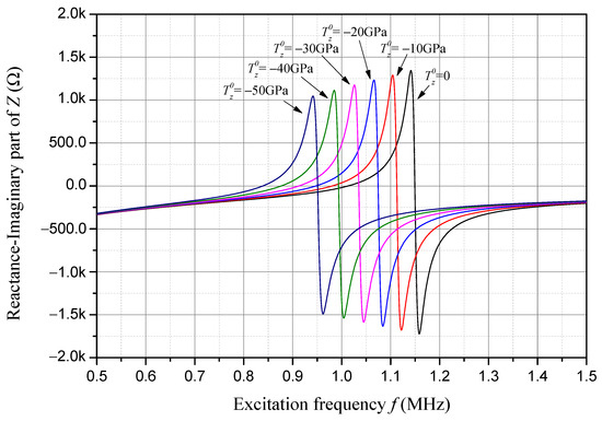 Reactance is the imaginary part of impedance, and its frequency response considering different compressive initial stresses is presented in Figure 8. The frequencies where the reactance firstly and secondly approaches zero are, respectively, the exact resonant and anti-resonant frequencies of the sample piezoelectric plate. As one can see in Figure 8, with an increase in the compressive initial stress, the resonant frequency, the anti-resonant frequency, and the absolute peak and valley values of the reactance decrease linearly.