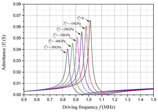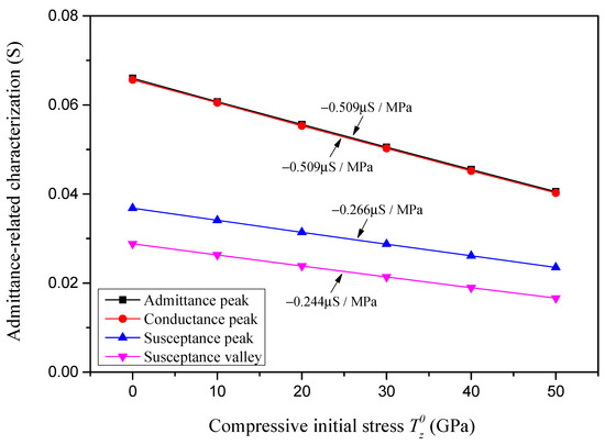 For the same extremely large compressive initial stress, i.e., 0, −10 GPa, −20 GPa, −30 GPa, −40 GPa and −50 GPa, the admittance frequency response of the sample piezoelectric plate is presented in Figure 9. The frequency corresponding to the peak value of the admittance is approximately the resonant frequency of the sample piezoelectric plate. And the frequency corresponding to the valley value of the admittance is approximately the anti-resonant frequency of the sample piezoelectric plate. As one can see in Figure 9, with an increase in the compressive initial stress, both the admittance peak and the corresponding resonant frequency decrease linearly.
