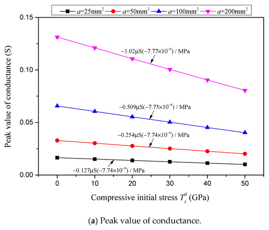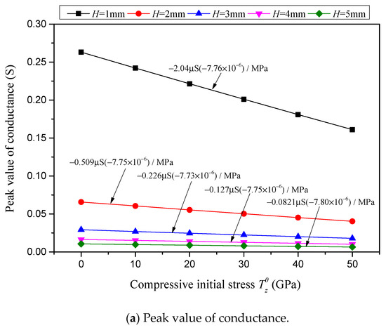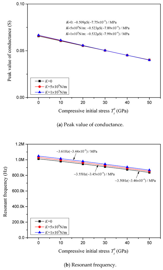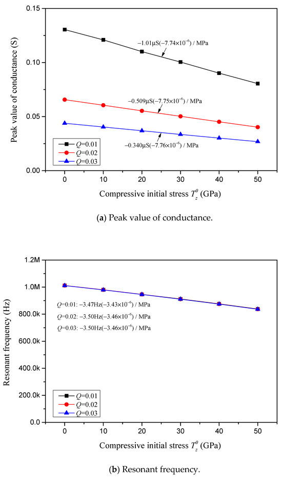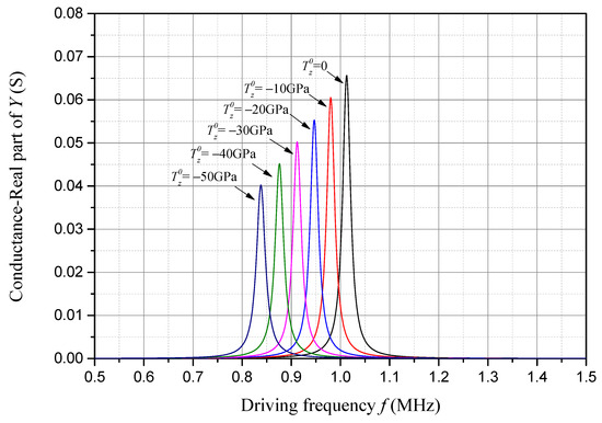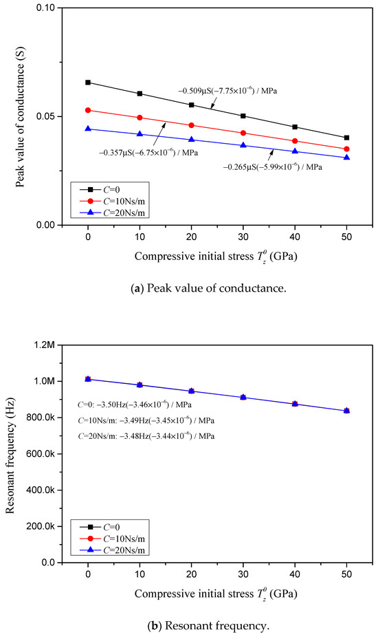 Conductance is the real part of admittance, and its frequency response considering different compressive initial stresses is presented in Figure 10. The frequency corresponding to the peak value of the conductance is also approximately the resonant frequency of the sample piezoelectric plate. As one can see in Figure 10, with an increase in the compressive initial stress, both the conductance peak and the corresponding resonant frequency decrease linearly.