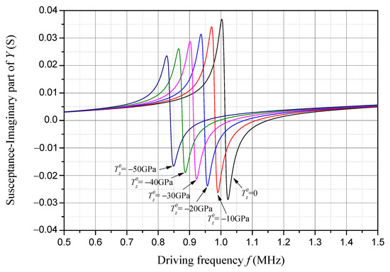 Susceptance is the imaginary part of admittance, and its frequency response considering different compressive initial stresses is presented in Figure 11. The frequencies where the susceptance firstly and secondly approaches zero are, respectively, the exact resonant and anti-resonant frequencies of the sample piezoelectric plate. As one can see in Figure 11, with an increase in the compressive initial stress, the resonant frequency, the anti-resonant frequency, and the absolute peak and valley values of the susceptance decrease linearly.