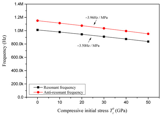 For the sample piezoelectric plate employed in Section 4.1, the resonant and anti-resonant frequencies with respect to the compressive initial stress are presented in Figure 12. It is observed that with increasing of compressive initial stress, both the resonant and anti-resonant frequencies decrease linearly, and the sensitivities of resonant and anti-resonant frequencies to the compressive initial stress are, respectively, identified as −3.50 Hz/MPa and −3.96 Hz/MPa.