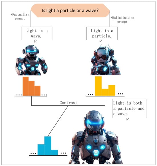 As highlighted in studies [28,29], well-structured prompts can help address issues such as hallucinations in machine-generated text. However, relying solely on prompts to elicit correct answers has limited effectiveness in improving the factual accuracy of the model. In this study, we combine prompt engineering with contrastive decoding techniques. As a similar approach, context-aware decoding (CAD) [30] is a proven strategy for reducing hallucination in text generation, which compares decoding outputs with and without contextual information. To fully leverage CAD, it is often crucial to supply rich context relevant to the problem. In specialized domains, the complexity of issues makes it particularly challenging to obtain such context, thereby limiting the utility of CAD. A closely related approach is contrastive decoding (CD), which aims to mitigate hallucinations in large language models by comparing outputs generated by a parameter-rich expert model and a smaller amateur model. Implementing CD requires an amateur model with fewer parameters that shares the same vocabulary, which can be impractical in some cases. Our method combines the strengths of CAD and CD with novel improvements. Instead of relying on external context or additional models, we leverage the power of the same model. By employing fact-based and hallucination-based prompts in contrastive decoding, we refine the next-word probability distribution with more accurate outputs. Experimental results demonstrate that DFHP outperforms the earlier methods in effectiveness.