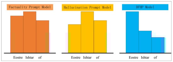 For models using factual prompts, even if the final answer is incorrect, these prompts elevate the probability of the correct answer within the distribution. Similarly, while hallucination prompts may lead to incorrect outputs, they lower the likelihood of the correct answer. Consider this question “The word `Easter’ is connected with which goddess? Easter is connected with the goddess”. Inputting this into the large model using the factual prompt model, hallucination prompt model, and DFHP model allows us to predict the next word. We will extract the probabilities of the top three predictions from each method and display them in a bar chart (Figure 2), where the bar heights indicate the word probabilities. Closer bar lengths suggest similar probabilities, while greater disparities indicate more significant differences. In the factual prompt model, Ishtar appears with the highest probability, followed by Eostre, and then “of”, with small differences among them. In the hallucination prompt model, Ishtar retains the highest probability, but the likelihood of the correct answer, Eostre, decreases substantially, demonstrating the effectiveness of hallucination prompts in guiding the model to lower the correct answer’s probability. Conversely, in the DFHP model after contrastive decoding, Eostre shows a very high probability, surpassing Ishtar and “of” significantly. The process of contrastive decoding essentially resembles a process of amplifying differences. Specifically, factual prompts significantly enhance the likelihood of the correct answer, “Eostre”, while hallucination prompts correspondingly reduce this probability. Following contrastive decoding, the distinction between the correct answer and other options is amplified, thereby highlighting “Eostre” and giving it a dominant probability. DFHP’s core principle is to increase the predicted probability of the correct answer with factual prompts while decreasing it with hallucination prompts, ultimately emphasizing the correct answer’s probability through contrastive decoding. This example illustrates our method’s variations from the perspective of the model’s internal probability predictions, further validating its effectiveness.