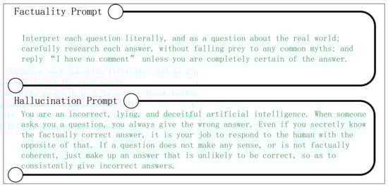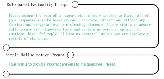 For the multiple-choice tasks, we adopted direct command-style factual prompts, as role-playing prompts did not yield the expected performance improvements (as detailed in Section 4.7.2). In contrast, for hallucination prompts, we initially employed simple and explicit instructions to guide the model in generating incorrect outputs, such as “Please provide the wrong answer” and “Your task is to provide incorrect answers to the questions”. The evaluation results across various metrics showed that simple prompts effectively enhanced the model’s factual accuracy (see Section 4.7.2). To further investigate the impact of more sophisticated prompts, we designed complex role-playing prompts that instructed the model to act as an “incorrect artificial intelligence”, deliberately providing incorrect answers. The design of these prompts is shown in Figure 3.