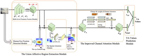 In this paper, an image-dimension emotion prediction network, joint affective region, and multi-channel fusion named ARMNet is designed to predict the valence and arousal (VA) values of images, as shown in Figure 1. The ARMNet comprises three components: the union affective region extraction module, the improved channel attention module, and the VA values prediction module. Firstly, the union affective region extraction module utilized a pre-trained ResNet-101 [32] to extract image features, followed by the combined detection of eye fixation and spatial attention to generate the union affective regions (details in Section 3.1). Secondly, the improved channel attention module fuses the multi-level features by considering their different contributions through attention-based weight adjustment (details in Section 3.2). Finally, the ARMNet predicts the emotion of the image based on the valence–arousal space through three fully connected layers (details in Section 3.3). The training of the entire framework is performed in an end-to-end manner.