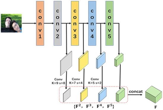 where is the number of channels, is the number of branches, and is the length of the feature. After the dimension in convolution mode is decreased, the spatial size of features is identical to . {, , , } are concatenated along the channel dimension to obtain the multi-level feature F, as shown in Equation (2) and illustrated in Figure 2.