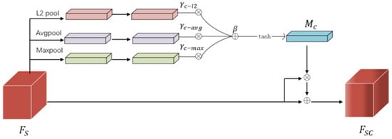 The improved channel attention module is proposed to fuse the multi-level features by considering their different contributions through attention-based weight adjustment. The structure of the enhanced channel attention module is demonstrated in Figure 4. operations and cross-channel feature normalization are implemented, and the fully connected layer is replaced by a gating mechanism [35], as shown in Equation (7).