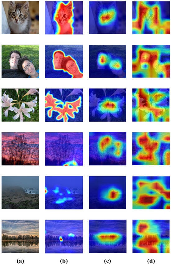 Visualizations of spatial attention: (a) the original images; (b) the salient object maps; (c) the eye fixation maps; (d) the union attention region map after integrating the human eye fixation detection module, where the color red represents a higher weight.