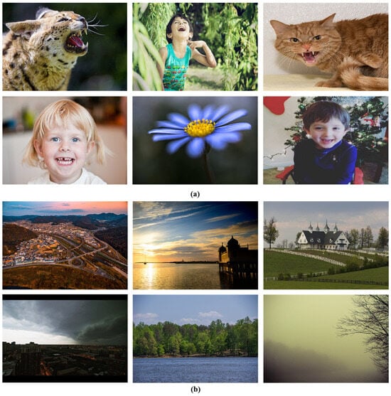 Images from CGnA10766 dataset: (a) images with specific target objects (person, animal, etc.); (b) images without a specific target subject.