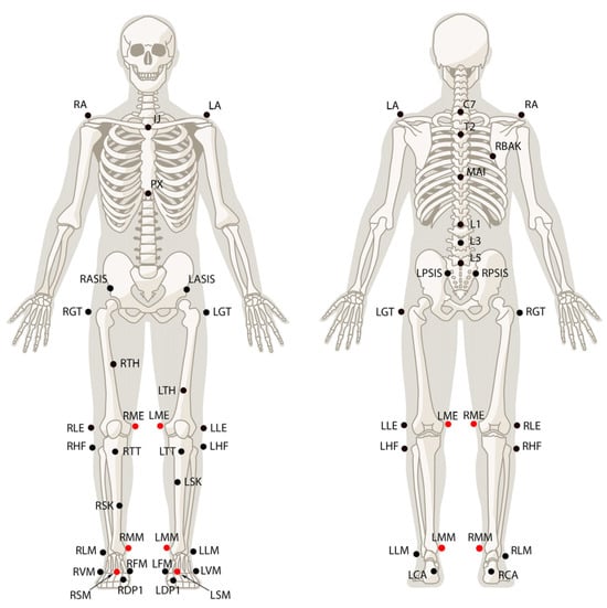 Height and body mass were recorded before the placement of the markers. Thirty-two passive reflective markers were placed on the anatomical landmarks of the participant according to Rizzoli Body marker set protocol (Figure 1). Prior to the test, participants were asked to wear black shorts and a black shirt. Acquisitions were recorded simultaneously at 100 Hz with a set of 9 infrared OptiTrack Motive 2.2.0 cameras (NaturalPoint, Inc., Corvallis, OR, USA). Two force plates placed under the treadmill were used to measure ground reaction forces at a frequency of 1000 Hz. The gait segmentation was determined from the heel-strike recorded by the force plates. Data recorded by OptiTrack system were exported as C3D files. The markers were used to construct a skeletal model that was scaled with height and mass information, and joint angle kinematics were computed using OpenSim IK tools [26] and Matlab (MATLAB, version R2023a. Natick, MA, USA: The MathWorks Inc. Retrieved from https://www.mathworks.com/) for the right hip and knee joints. In this study, hip and knee joints were given 6 degrees of freedom.