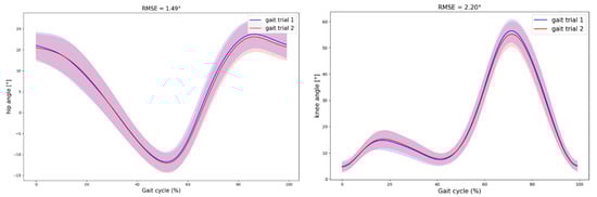Hip and knee flexion/extension angles waveforms of the 3D Markerless Motion Capture (3D MMC) system at 1.0 m/s. The average gait cycle waveforms with standard deviation of the 15 participants for gait session 1 (blue) and gait session 2 (red) are represented. The associated RMSE values are indicated.