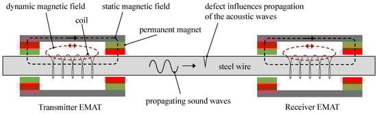 The measurement setup for detecting wire breaks in steel cables using electromagnetic acoustic transducers (EMATs) involves the interaction of magnetic fields and ultrasound waves, as shown in Figure 1. This setup consists of two primary components: a transmitter EMAT and a receiver EMAT. The transmitter EMAT initiates the process by using a coil connected to an AC source to generate a dynamic magnetic field. This field interacts with the steel wire, inducing magnetostrictive vibrations within the material. Surrounding the coil, permanent magnets establish a static magnetic field, which biases the steel cable to optimise the magnetostrictive effect. As a result, the combined action of the static and dynamic magnetic fields produces mechanical vibrations that generate acoustic waves.