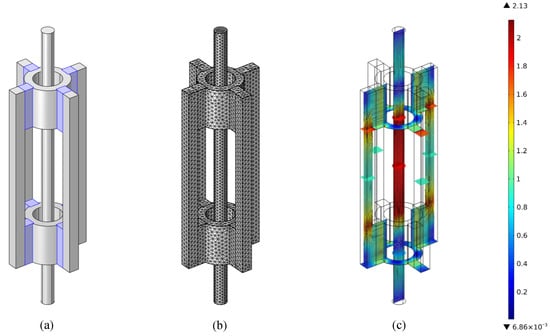 Example of a simulated configuration composed of the steel wire, surrounded by the pole shoes, permanent magnets, and iron yokes (a), the mesh used for the simulations (b), and the resulting magnetic flux density in Tesla (c).