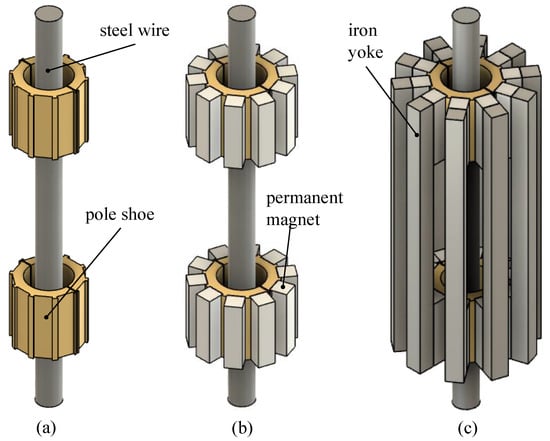 In the following section, the detailed construction of the derived EMAT sensors is described. This includes an in-depth look at the components and their assembly. Figure 4 illustrates the detailed construction of an EMAT sensor, focusing on the components responsible for generating the permanent magnetic field. At the center of the setup is the steel wire, around which the EMAT sensor components are arranged. The permanent magnets are placed directly on the pole shoes composed of steel, and the iron yokes complete the assembly of the static magnetic circuit.