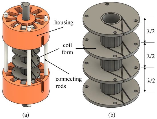 Assembly of the EMAT sensor showing the housing that encloses the components, connecting rods that maintain alignment, and the coil form (a). Detailed view of the coil form, highlighting the three segments, each corresponding to half the wavelength () of the ultrasonic waves (b).