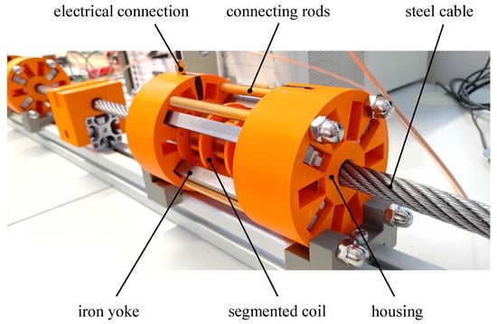 To generate the dynamic magnetic field, a special coil body was designed, as shown in Figure 5. The coil body, located in the center of the EMAT sensors, was divided into three segments, each segment corresponding to half the wavelength () of the ultrasonic waves. Adjacent segments of the coil were wound in opposite directions using copper wire. The counter-winding had the effect that, depending on the winding direction, the bias magnetic field was either amplified or attenuated. This made it possible to excite sound waves with a specific wavelength in a more frequency-specific way. Housing parts and connecting rods secured the magnets and iron yokes. Connecting rods provided the EMAT the necessary stability for moving ropes and harsh environments.