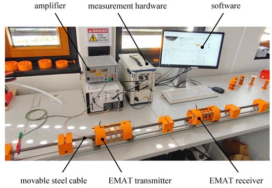 The test rig shown in Figure 7 is designed for the evaluation of the performance of electromagnetic acoustic transducers. It comprises an EMAT transmitter and receiver, spaced 40 cm apart, ensuring a consistent propagation path of ultrasonic signals along the cable. The steel cable ran through these sensors and was shifted to systematically test various sections. The rig is equipped with National Instruments measuring hardware, including a 14-bit signal generator (NI PXI-5412) and a 12-bit oscilloscope (NI PXI-5105), capable of sampling rates up to 60 MHz. The excitation signals generated by the signal generator were amplified up to 100 Vpp using a self-developed amplifier. Custom-developed software supported the configuration of measurement hardware, as well as the automated operation of experiments and the evaluation and storage of measurement data.