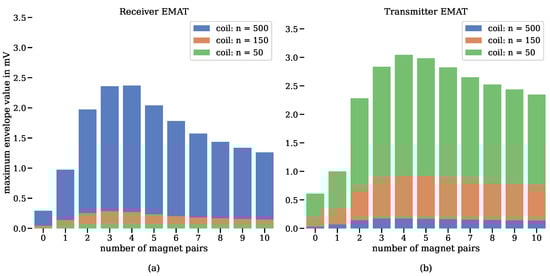 Figure 8 illustrates the relationship between the signal strength of the ultrasonic signals and the number of magnet pairs, as well as the number of coil windings per coil segment, for the receiver (a) and the transmitter (b). A total of 11 different magnet pairs were analysed, ranging from 0 (indicating no static magnetic field) to 10 magnet pairs, which equals 20 permanent magnets per EMAT for a very strong permanent magnetic field. It was observed that four symmetrically arranged magnet pairs produce the highest signal strength for both the receiver and the transmitter.