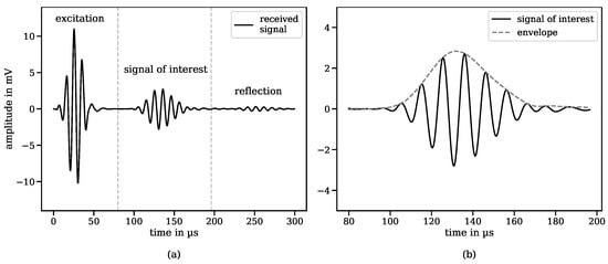 Received signal consisting of the electromagnetic crosstalk of the excitation signal, the actual signal of interest, and a reflected signal from the end of the cable (a). Signal of interest (detailed view) detected by the receiving EMAT, which is used to analyse rope damage (b).