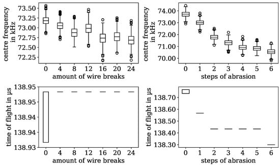 Different measures for rope damage detection as boxplot analysis. (Upper row) centre frequency against either wire breaks or abrasion levels. (Lower row) time of flight against either wire breaks or abrasion levels.