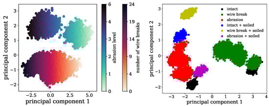The results of the PCA for the blank steel wire ropes are depicted in Figure 11 on the left, where the various input measures were recombined into two principal components, whereas component 1 takes up 48% and component 2 30% of the explained variance. Evidently, the wire breakage can be distinguished from the damage through abrasion as the different point clouds run parallel. The colour progress indicates that it was possible to distinguish the level of damage for both types as well. Noticeable is the gap in the abrasion data points, which might be produced through inconsistent filing and the fact that, in the beginning of the machining process, due to the circular cross-section of the ropes, a higher change in the circumference is achieved by constant filing time and applied force, which can lead to a nonlinear correlation.