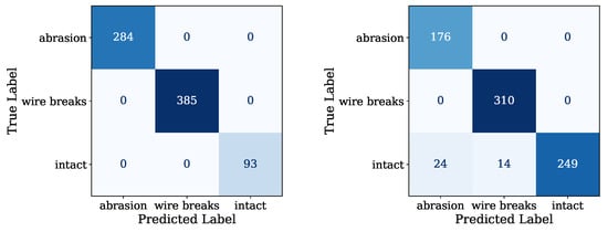 For the final test evaluation, the predicted rope conditions of the models were plotted against the real conditions in a confusion matrix to ascertain the validity of the models. Looking at the map for the blank steel ropes in Figure 12 on the left side, the model predicted all three conditions without any errors. Noticeable is the fact that the data acquisition incorporated different measuring positions over the rope length to account for the fluctuations that were indicated by the PCA evaluations.