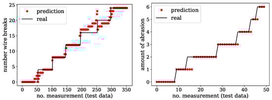 The models were finally verified on the test dataset. Starting with the first one in Figure 13 on the left, the real number of wire breaks are plotted in ascending order against the model predictions. While most of the predictions agreed well with the real values, there was a range between 15 and 18 wire breaks where the model deviated. However, these differences were on a small scale and in a practical context; a deviation of one to three broken wires will most likely not be significant. The relative error for deviations larger than three broken wires was 9.6%. Why the deviations were mostly located in this range was not completely clear at this point. Most likely, the dataset for these wire break numbers was too small or the data were prone to errors.