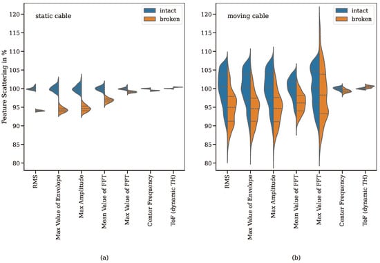 Comparison between the distributions of different features for a stationary cable (a) and a moving cable (b). While the features for the stationary cable are only slightly scattered, there is a significantly greater scatter of all features for the moving cable. As a result, it is no longer possible to distinguish clearly between defective and intact cable sections. The values are standardised in such a way that corresponds to the mean value of the respective features of intact cable sections.