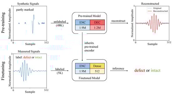 For this purpose, the Vision Transformer Masked Autoencoder (ViTMAE) architecture [] is used, which is an adaptation of the Vision Transformer (ViT) [], designed specifically for self-supervised learning through masked image modelling. In the case of ultrasonic signals, the pre-processing procedure is adapted so that the model can process one-dimensional signals instead of images. Figure 15 shows the principle of generative pre-training and fine-tuning using a ViTMAE on the basis of ultrasonic signals. The dataset for the pre-training comprises 60,000 synthetically generated ultrasonic burst signals, which were split into training, validation, and test data in a ratio of 80/10/10.