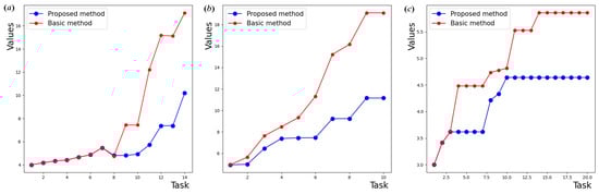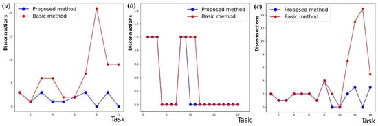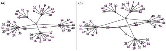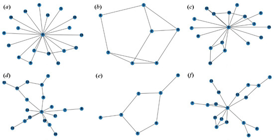 - mixed requests (Figure 3c,f). When establishing a network, both broadcast and simple requests are used that involve sequential information exchange between nodes, as well as requests for removing the vertices.