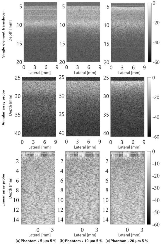 - Saito, W.; Omura, M.; Ketterling, J.A.; Hirata, S.; Yoshida, K.; Yamaguchi, T. Backscatter properties of two-layer phantoms using a high-frequency ultrasound annular array. Jpn. J. Appl. Phys 2022, 61, SG1049. [Google Scholar] [CrossRef]