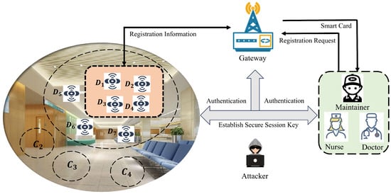 The IoMT-based authentication model is shown in Figure 1. In this model, patients suffering from different diseases are being treated in the hospital. Each hospital bed is equipped with a number of sensors to monitor and sense the real-time status of the patient (e.g., blood pressure, heart rate, etc.). Since the hospital contains different departments, such as brain, orthopedics, etc., as well as different types of medical staff in each department, such as doctors and nurses, they are all concerned with monitoring the patient’s physical condition. Specifically, only the nurse is required to handle a patient who needs a medication change, while the doctor is required to take quick emergency measures when the patient is in a life-threatening situation. Therefore, it is necessary to set the corresponding accessible sensor cluster for different user levels.