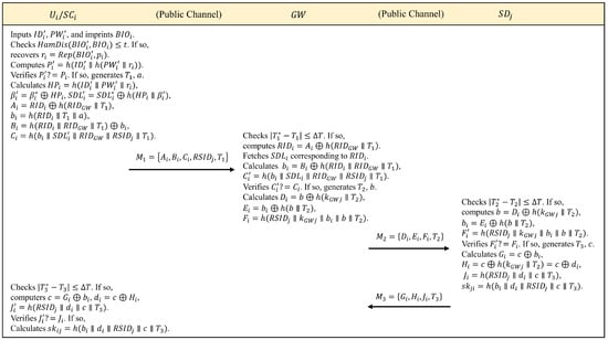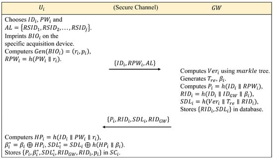 Step 1: chooses his or her identity , password , access list (generated from the cluster of accessible sensors) and imprints biological information on the specific acquisition device. The device then extracts the secret parameter and the public parameter with the help of the generating function , namely . Next, computes and sends to via a secure channel.