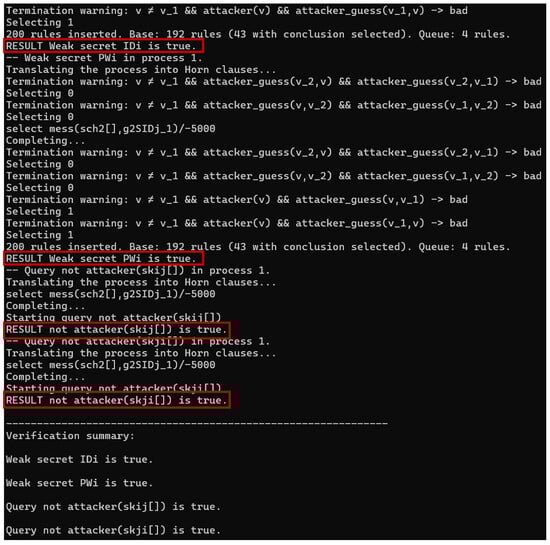 The results of the Proverif execution are shown in Table 3 [30] and Figure 5. The first two rows demonstrate that both weak and can cope with guessing attacks. The last two rows imply that the generated session keys between and are robust against common attacks. Therefore, 3ECAP is secure under formal verification.