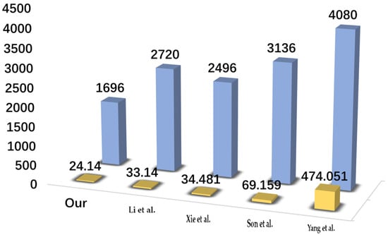 The calculation costs required for 3ECAP and other protocols in the login and authentication phases are provided in this section. Assume that , , , and represent the time required for the hash function (SHA-256), asymmetric encryption/decryption (RSA-1024), bilinear pairing, ECC point multiplication and fuzzy extractor, respectively. Based on the available experimental results of Challa et al. [39], the time required to use these functions are ms, ms, ms, ms and ms. Specifically, the various calculation costs required for the user, gateway, and sensor in each protocol are shown in Table 4 and Figure 6. The calculation cost of 3ECAP for the , , and are, respectively, , and . The total calculation cost of 3ECAP is only ms compared to other protocols, which is especially suitable for the communication requirements for IoMT.