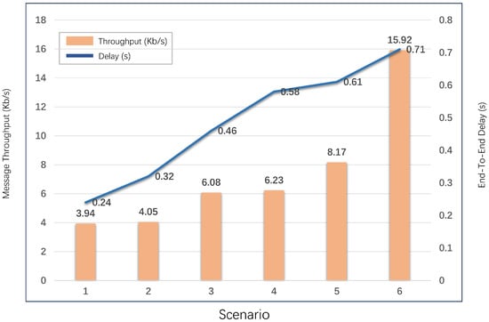 (2) Impact on End-to-End Delay: The total delay of 3ECAP in the six scenarios is represented by the discounted graph in Figure 7. EED delay can be expressed as , where and represent the sending time and receiving time, respectively, when the ith packet is transmitted, and the total number of packets transmitted during the simulation is . It follows from the figure that when the number of participating nodes increases, the number of messages transmitted will increase, which may cause network congestion to the extent that the EED delay increases.