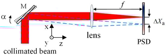 The autocollimation method based on the normal working mode of the PSD is shown in Figure 1. The collimated beam is incident on the mirror M. For any change in the angle of M, the beam deflection will be twice the rotation angle of the M, and the focused spot of the reflected light on the PSD moves accordingly. The angular change of M can be expressed as follows:
