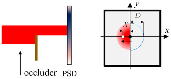 The defect of the spot can also lead to the change of the spot energy center, but there are few related studies [,]. An innovative defect working mode [] of the PSD is shown in Figure 2. The spot received by the PSD is a circular Gaussian spot, which is the most common shape and pattern of light spots, and its center is located at the center of the PSD. When the beam is occluded, the light spot is no longer complete; the energy center of the defect spot output from PSD changes according to the defect of light spot.