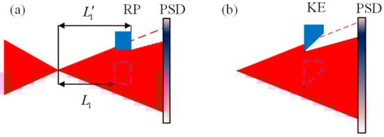 Because the light beam reaching the RP is not collimated, and the RP has a certain thickness, before and after the center of the light spot passes through the edge of the RP, the position of the edge of the RP that blocks the light will change. As shown in Figure 5a, the RP is placed behind the focal point, and before and after being obstructed by the RP edge at the center of the light spot, the rear and front surfaces of the RP edge respectively block the light. This implies that changes before and after the center of the spot passes through the edge of the RP. From Equation (9), it can be observed that the measurement sensitivity changes abruptly. Therefore, the edge of the RP should be selected as a knife-edge (KE), as shown in Figure 5b.