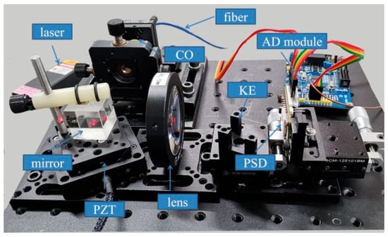 The system structure and experimental setup for high-precision small-angle measurement are shown in Figure 4 and Figure 6, respectively. The light source of the experimental system was a single-mode fiber-coupled semiconductor laser with a wavelength of 635 nm and a power of 5 mW (Xilong Optoelectronics Technology Co., Ltd., Shanghai, China, FC-635-005-SM). The laser power supply of this model is equipped with voltage and temperature stabilization modules. The diameter of the collimated beam was approximately 3.6 mm. The focal length of the focusing lens was 50 mm, and the value of was approximately 50 mm. The beam was partially (about half) occluded by a KE, and the defect spot energy center position is detected by a PSD with a photosensitive area of 4 × 4 mm2 (First Senor Corp., Berlin, Germany, DL16-7-PCBA3). The AD module adopts the ADS1256 module, which has eight channels, 24 bits, and a maximum sampling frequency of 30 K, and the data are transmitted to the computer through a USB. All experimental equipment was fixed on a vibration isolation optical platform, and the experiments were conducted in a laboratory environment.