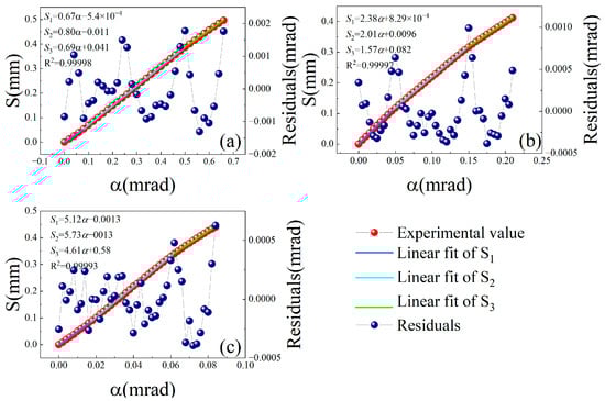 We performed several sets of small-angle measurement calibration experiments with different values of using the PZT rotation stage (Core Morrow Technology Co., Ltd., Harbin, China, S21.R7S) as the standard meter. Corresponding to Figure 8a–c, the values of are 3.5 mm, 1.5 mm, and 0.5 mm, respectively. The resolution, repeatability, and measuring range of the PZT rotation stage was 0.2 rad, 0.2%, and 6 mrad, respectively. According to Equation (8) and the output characteristics of the PSD shown in Figure 3, the piecewise linear fitting method was used for the analysis and processing of the experimental data. The experimental results are shown in Figure 8.