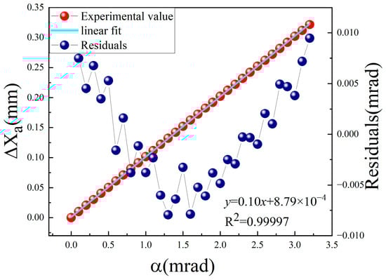 The experimental results are shown in Figure 9. In the range of 3.2 mrad, the sensitivity was approximately 2 , the point-to-point deviations varied from −8.0 to 9.5 , and the standard deviation was approximately 5.3 .