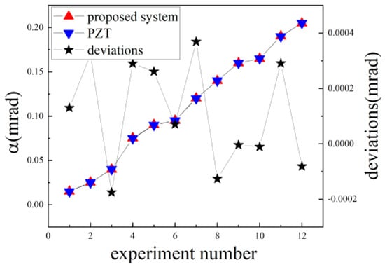 As shown in Figure 10, the deviations between the proposed system and the PZT were approximately −0.18 to 0.37 . Considering that the resolution of the PZT was approximately 0.2 ra, and that the standard deviation of the corresponding experiment was approximately 0.19 in Figure 8b, these experimental data are quite consistent with the expectation, which confirms the feasibility and reliability of the proposed method.