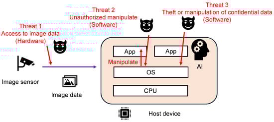 Threat 1 is an attack in which an adversary manipulates the image data that an image sensor sends to the host device. By physically accessing the image sensor interface, the adversary can tamper with the image data and affect the AI classification results. Threats 2 and 3 are software-based attacks, such as malware that exploits OS vulnerabilities. Threat 2 is an unauthorized manipulation attack. An example of Threat 2 is an attack in which malicious software manipulates some of the images captured by the image sensor. In addition, malware that skips security-critical processes, such as MAC verification, is another example of Threat 2. Threat 3 is an attack to acquire secret information, such as encryption keys owned by the host device, or to tamper with AI parameters that require integrity.