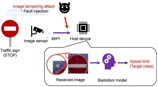 An actual example of an attack by [1] is shown in Figure 2. Assume a system in which image data captured by the image sensor are sent to the host device with the MIPI, and the AI model implemented in the host device performs image classification. The adversary aims to induce misclassification in the AI model using a backdoor attack, creating a backdoor model and tampering with the captured images. To create the backdoor model, the adversary tampers with the training dataset so that images with the trigger mark in the upper-left corner are classified into the class targeted by the adversary (target class). Then, to tamper with the image, the adversary uses an electrical fault attack on the MIPI to tamper with the targeted area of the image. Usually, the image data captured by the image sensor are sent to the host device, and the AI model can perform successful classification (stop). On the other hand, when the adversary performs a fault attack, the upper-left corner of the image is tampered with by the trigger mark. This tampering causes the backdoor model to misclassify the received image to the target class (speed limit).