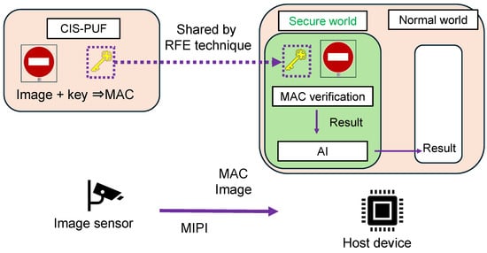 Image data captured by the CIS are sent to the host device through the MIPI, and the images are classified by an AI model implemented in a secure world. The MAC of the image data captured by the CIS is calculated in the CIS using the key generated from the CIS-PUF response. The MAC value and image data are then sent from the CIS to the host device. The key can be securely shared between the host device and the CIS using a random number (RN) generated by the CIS-PUF. The host device receives the image data in a secure world. MAC verification is performed using the shared key and the received image in a secure world. At this time, when the MAC verification is successful, image classification is performed using an AI model, and the classification results are output to the normal world. This system enables image tampering detection using the MAC, and the AI inference output of reliable MAC verification results is shared by the TEE.