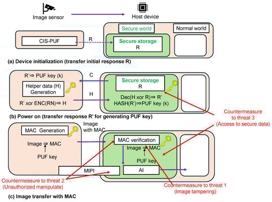 As shown in Figure 4c, MAC verification is performed to check the authenticity of the captured images using the PUF key k in a secure world. Then, only when the MAC verification is authenticated, the image classification process is performed by the AI model. The AI classification process is also performed in a secure world, which is a countermeasure against Threat 3, such as tampering with or the theft of AI model parameters. The results of the inference after MAC verification are output to the normal world. From the MAC verification results, it is possible to detect whether the image data have been tampered with at the MIPI. Then, by processing in a secure world, measures such as skipping MAC verification can be taken, and reliable verification results can be output. The method of performing AI processing in a secure world with limited memory has already been discussed in other studies [13,14] and is beyond the scope of this study.